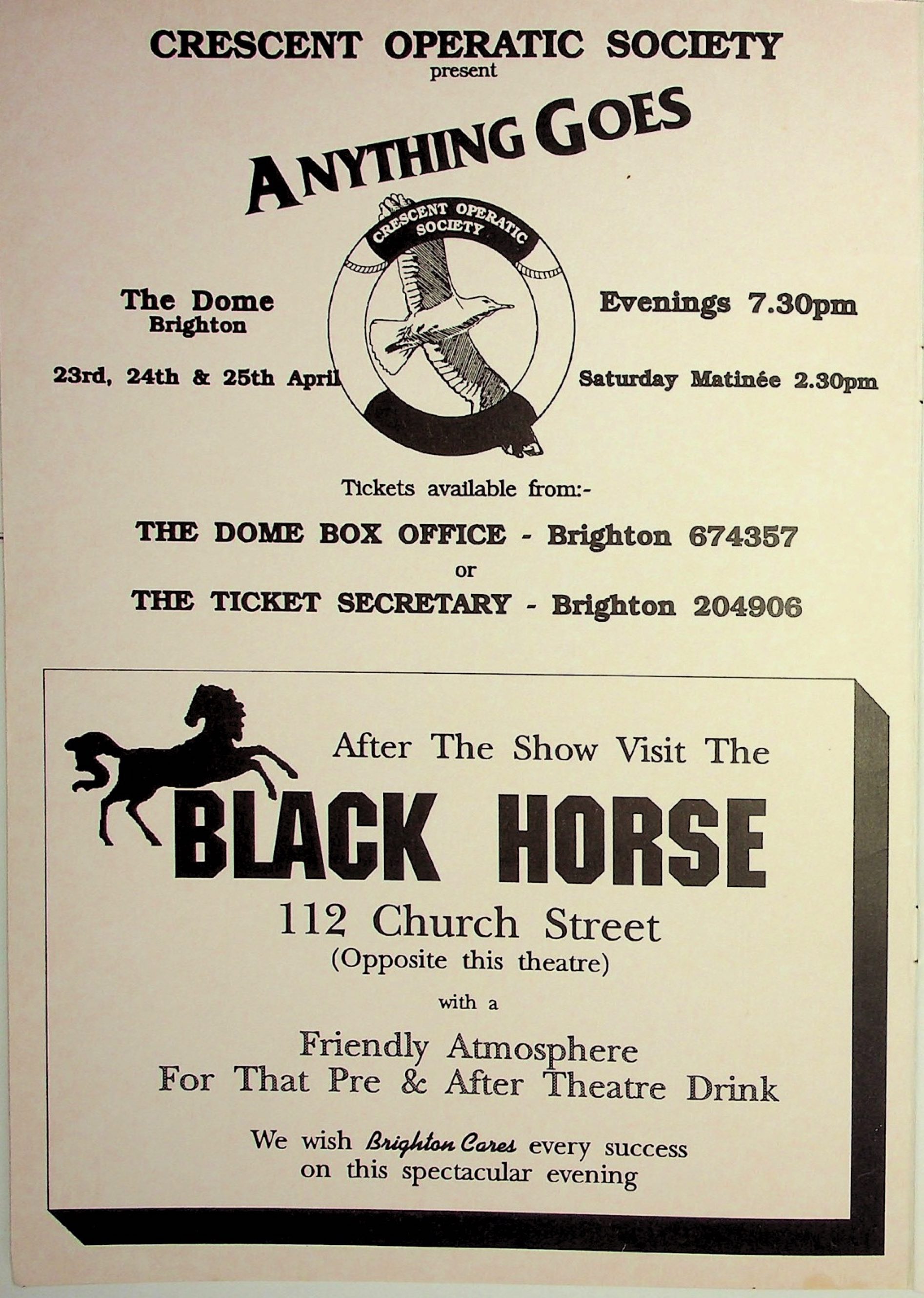 Adverts feature from The Black Horse, Crescent Operatic Society, Brighton Little Theatre, Madison Travel, Sussex Musical Theatre Group, David Foord-Brown Antiques, Brighton Theatre Group, The Wandering Minstrels', The Marlborough, Fudges, Brighton and Hove Operatics Society, Queens Head, Club Revenge, The Stage Door Cafe, The Bulldog Tavern, Queens Arms, Rowland House, The Beacon, The Juggler, Doris Isaacs School of Dancing, . D O'Mahony optician, Secrets