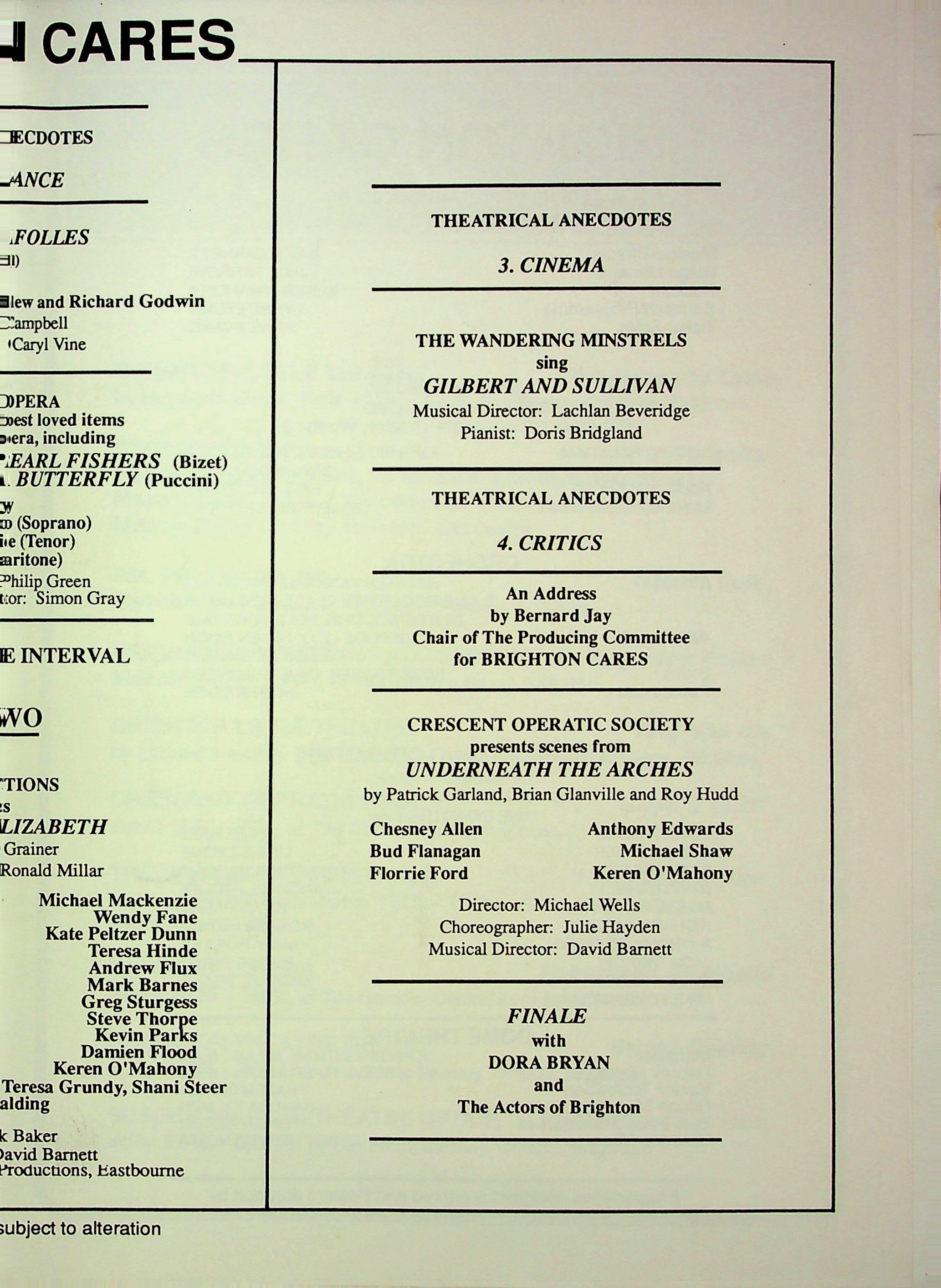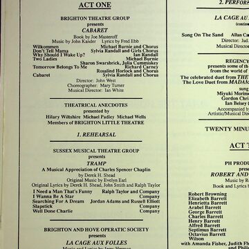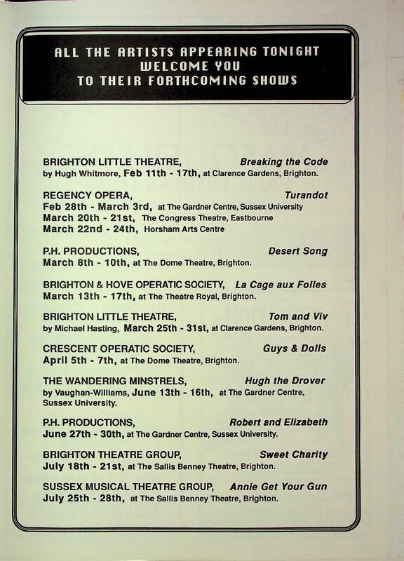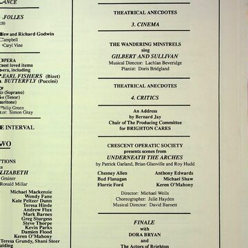 Musical comedy, operetta, opera, and theatrical anecdotes were performed by the actors of Brighton, devised and produced by Bernard Jay.