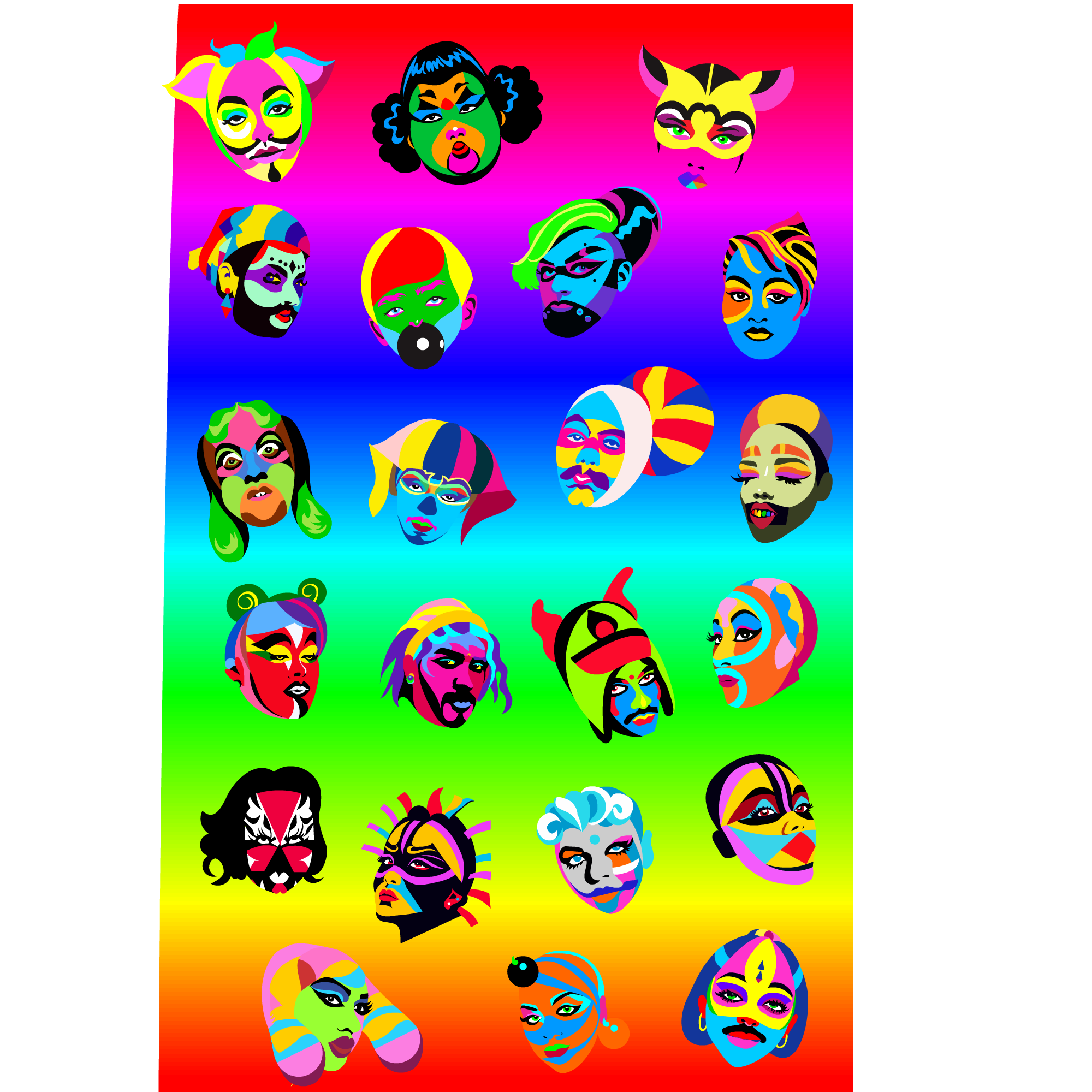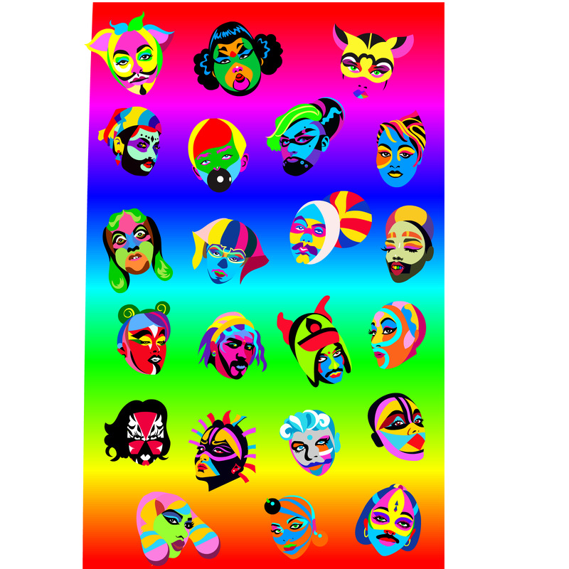Brighton Pride branding - I produced a range of Superqueeroes -a collection of fantastical disembodied heads of indeterminate age, race and gender - a melee of misremembered characters informed by my long years either in clubs, online or on travels! This was used across site and in all promotion online/offline for Autumn 2024