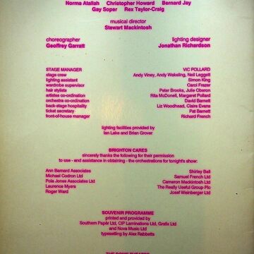 Adverts feature from The Black Horse, Crescent Operatic Society, Brighton Little Theatre, Madison Travel, Sussex Musical Theatre Group, David Foord-Brown Antiques, Brighton Theatre Group, The Wandering Minstrels', The Marlborough, Fudges, Brighton and Hove Operatics Society, Queens Head, Club Revenge, The Stage Door Cafe, The Bulldog Tavern, Queens Arms, Rowland House, The Beacon, The Juggler, Doris Isaacs School of Dancing, . D O'Mahony optician, Secrets