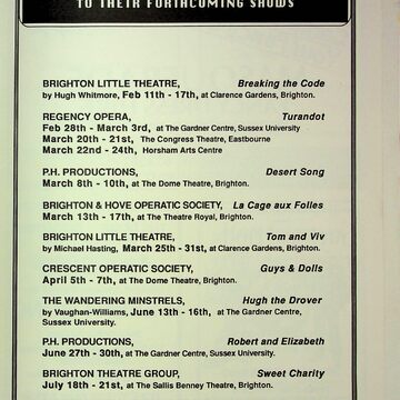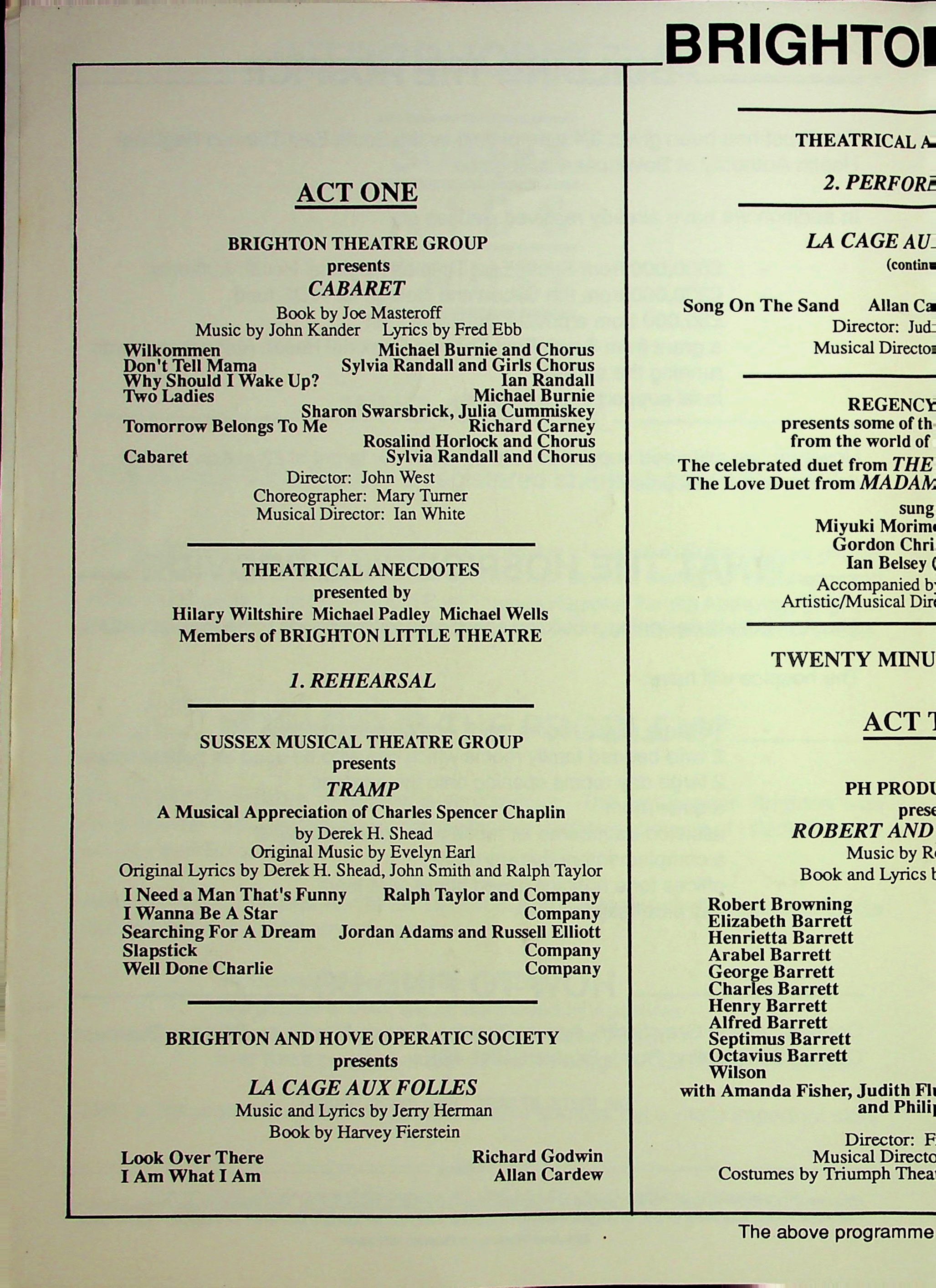 Musical comedy, operetta, opera, and theatrical anecdotes were performed by the actors of Brighton, devised and produced by Bernard Jay.