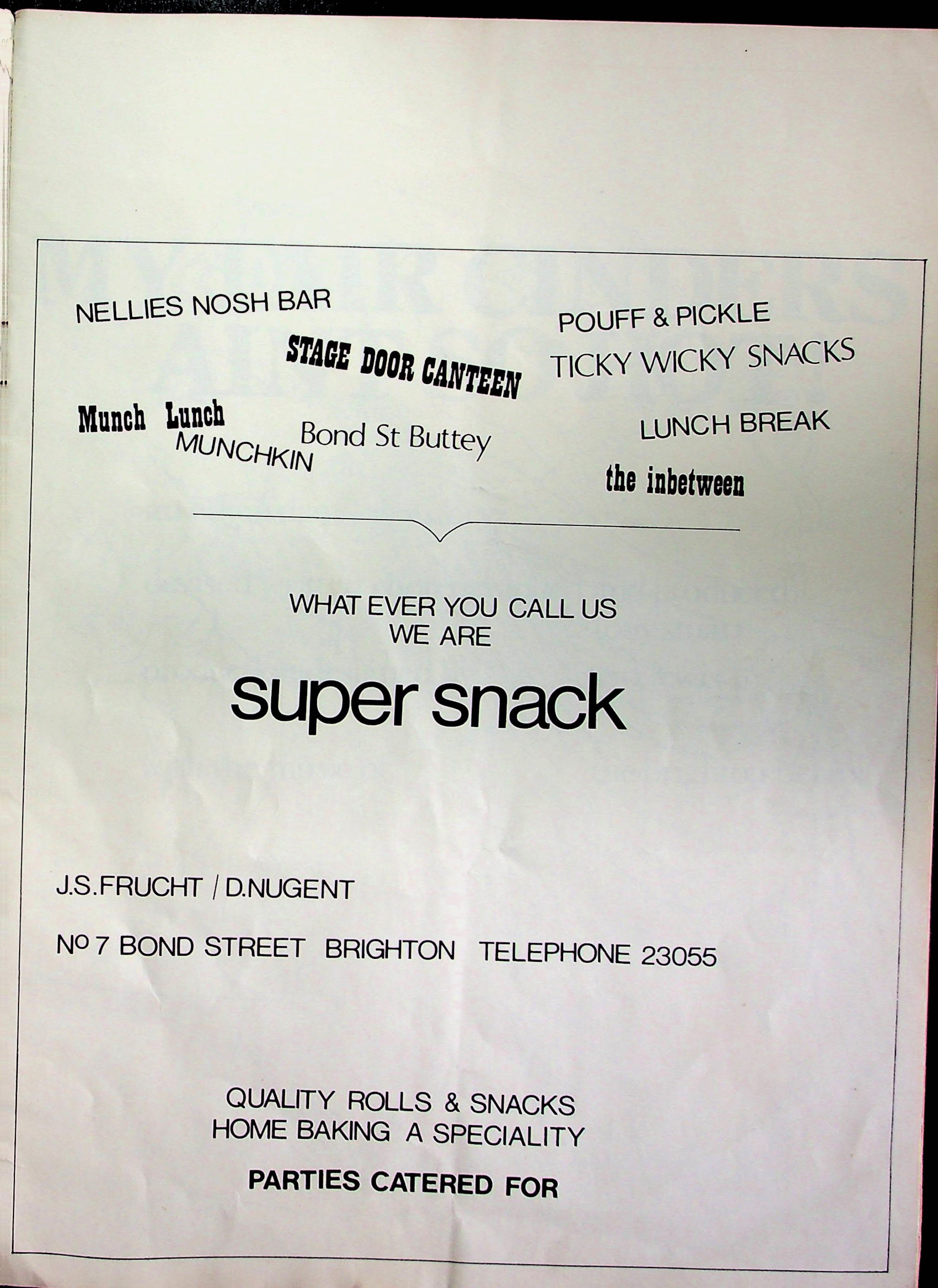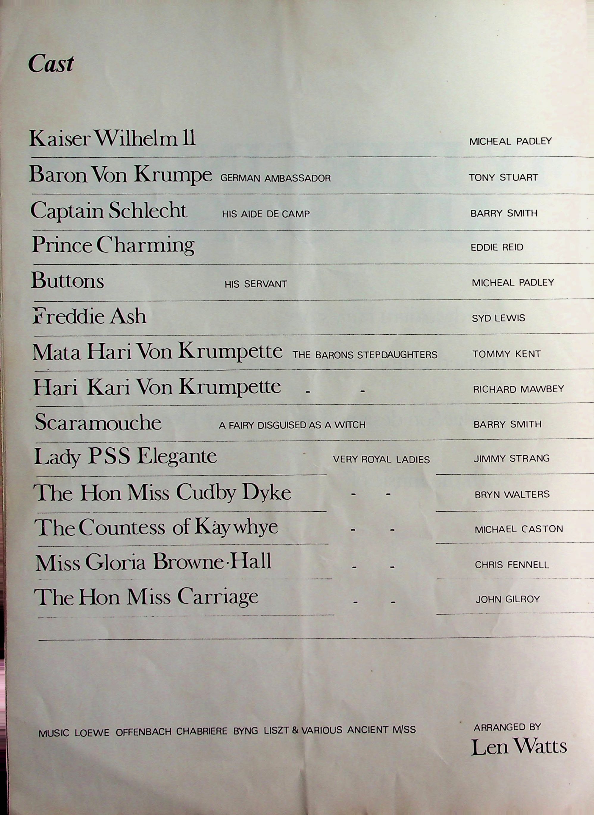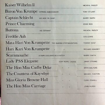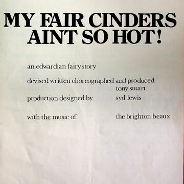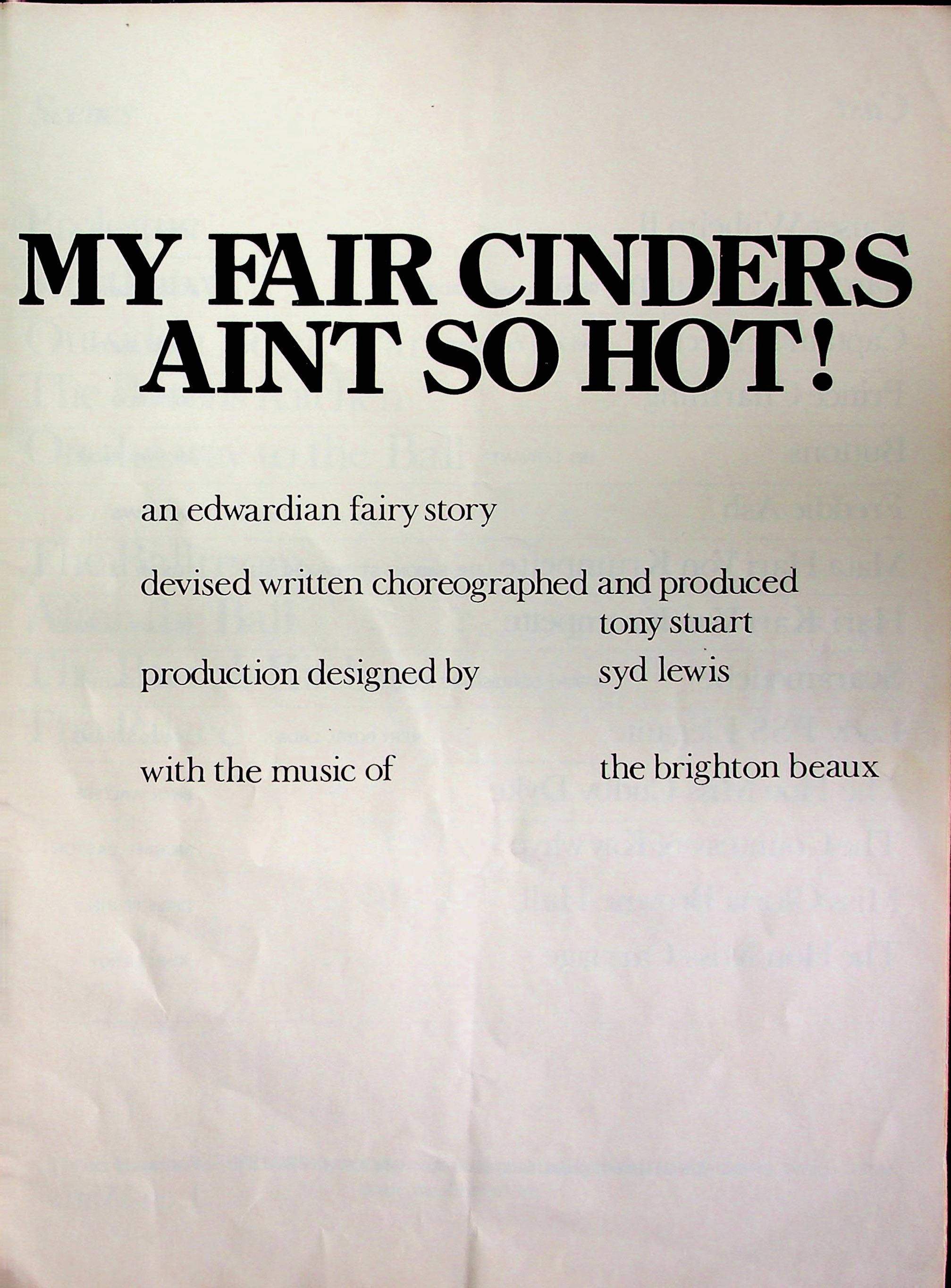 Programme for 'My Fair Cinders Ain't So Hot'. A pantomime produced by Brighton's Alternative Pantomime. The programme contains the cast, acts, credits and advertisements for local businesses.