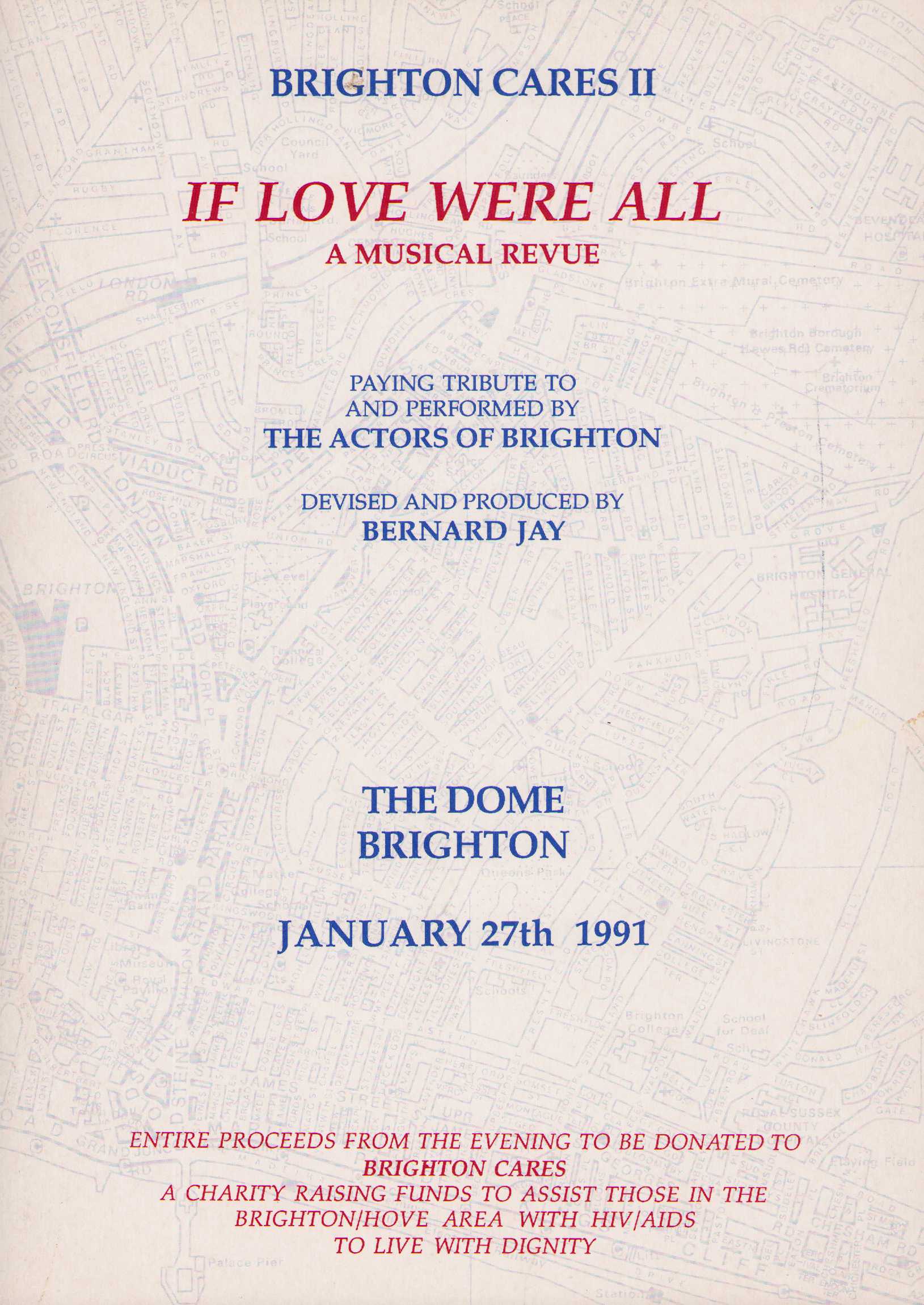 Theatre programme for Brighton Cares gala for HIV/AIDS, titled 'If Love Were All, A Musical Review'. The gala was designed and produced by Bernard Jay, and performed by The Actors of Brighton. The programme contains information about performers, a schedule for the event, a message from the mayor of Brighton, and advertisements for local businesses.