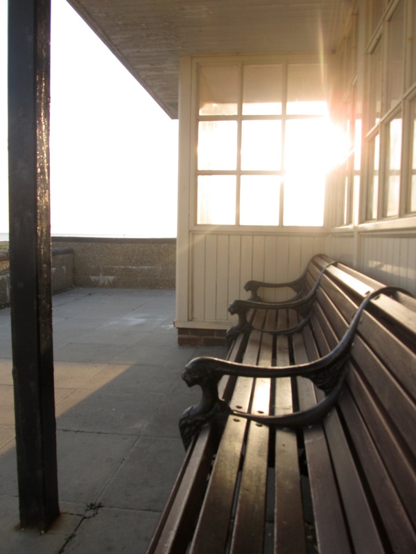 1. This photo depicts one of the benches along Brighton & Hove Seafront with the sun shining through the window next to it.